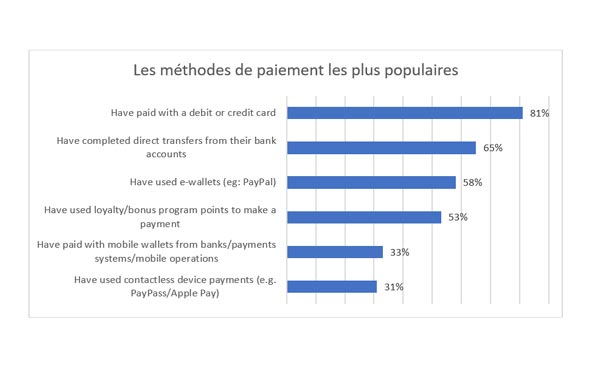 Le large éventail de méthodes de paiement numériques donne aux clients la liberté de choisir leur mode d’achat préféré pour les biens ou services. Les méthodes les plus populaires sont toujours les cartes de débit et de crédit, les virements directs à partir de comptes bancaires et les portefeuilles électroniques, par ex. PayPal. Cependant, d'autres méthodes de paiement gagnent en popularité. Les achats fréquents permettent aux utilisateurs de collecter des points via des programmes de fidélité et de les utiliser lors de la visite à un détaillant pour en acheter davantage. Et grâce aux smartphones et aux smartwatches, les consommateurs n’ont même plus besoin de transporter leur portefeuille, leur argent ou même de cartes en plastique. Cela a contribué à accroître la popularité des paiements sans contact sur les appareils, tels que PayPass et ApplePay, avec un tiers des acheteurs (31%) les utilisant régulièrement.