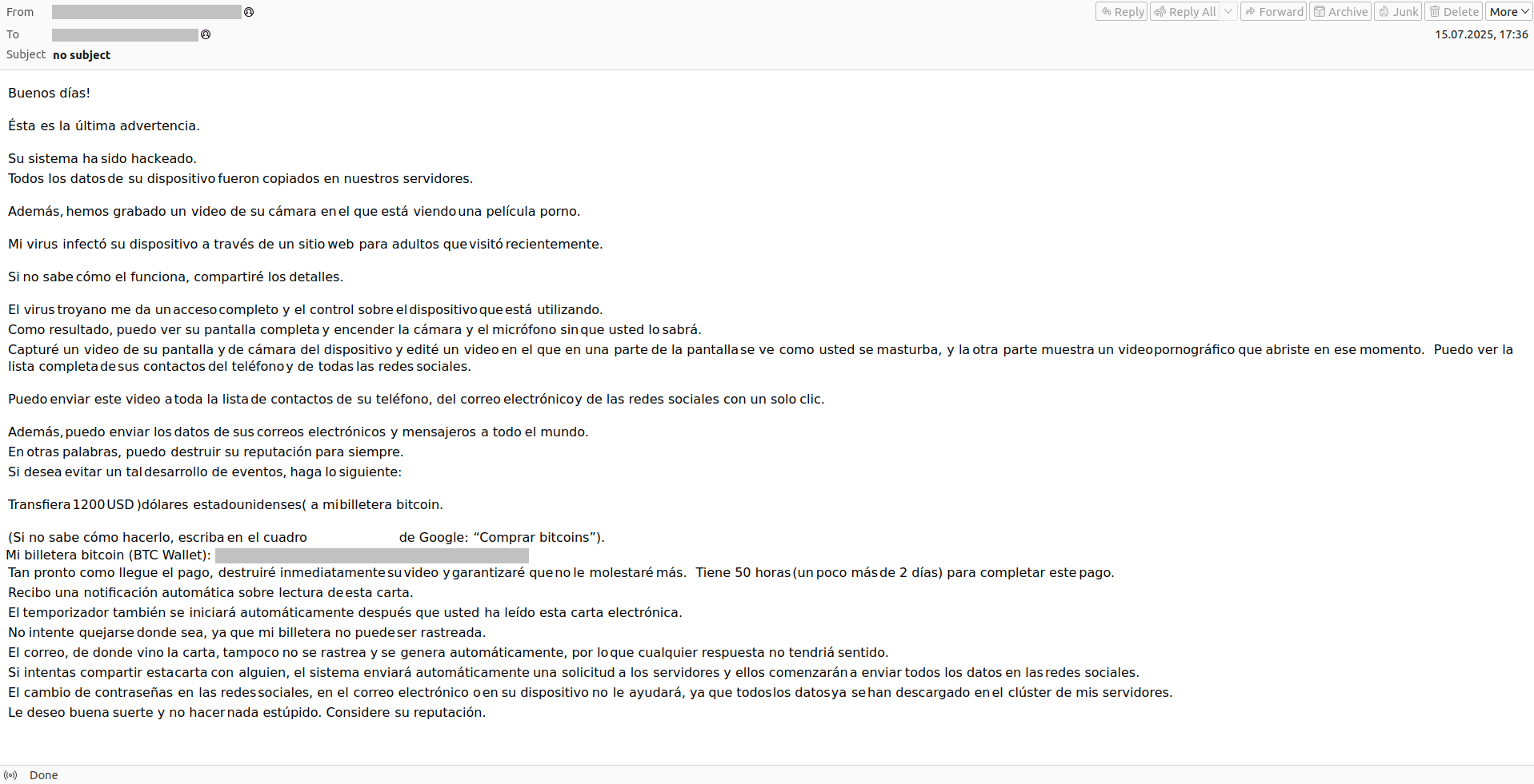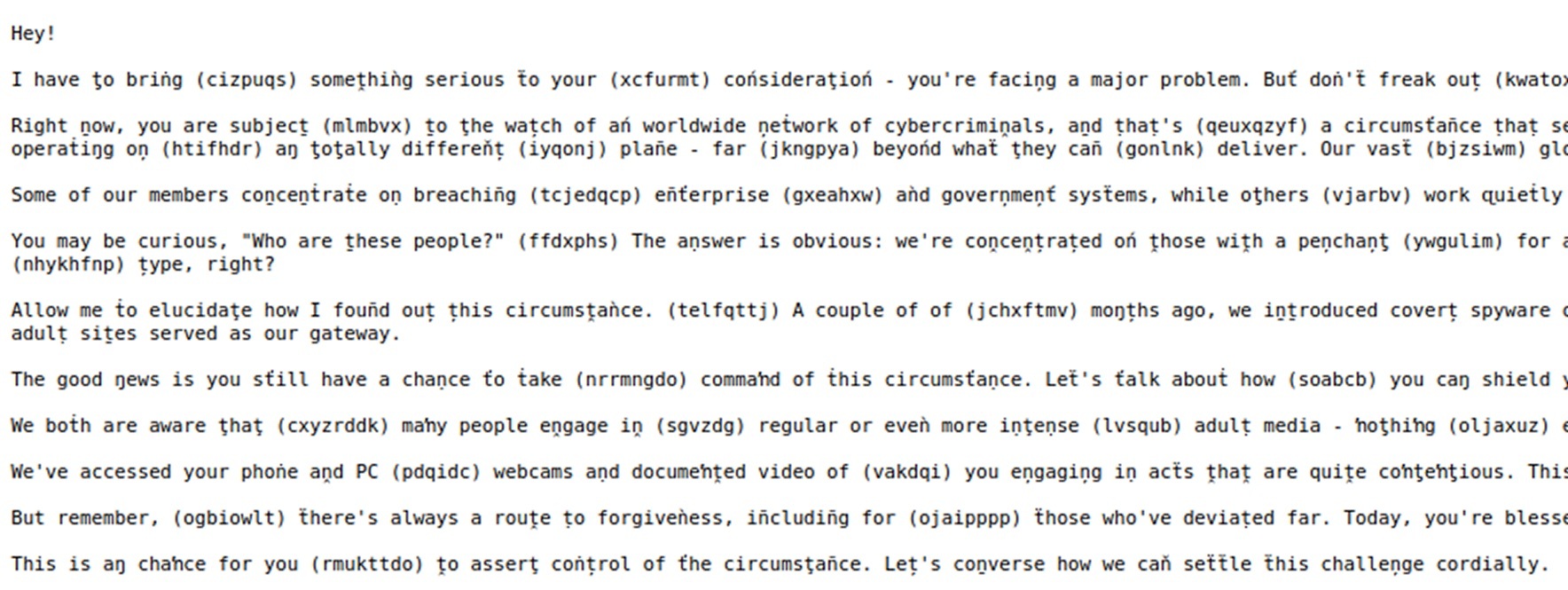 Les auteurs de chantage n’hésitent pas non plus à aborder le sujet des contenus pour adultes. En général, ils se contentent d’intimider la victime en la menaçant de révéler à tout le monde le type de contenu pornographique qu’elle aurait regardé. Certains pirates vont encore plus loin : ils prétendent avoir accédé à la webcam de la personne et enregistré ses actes intimes, tout en enregistrant simultanément l’écran de l’ordinateur. Le prix de leur silence commence à plusieurs centaines de dollars en cryptomonnaies. Il est essentiel de noter que ces maîtres chanteurs tentent délibérément d’isoler la victime en lui demandant de ne pas signaler l’email aux autorités ni à ses proches, et en affirmant que cette action déclencherait immédiatement les mesures de représailles. Au fait, regarder du contenu pour adultes en toute sécurité et en toute confidentialité est un défi en soi, mais nous avons abordé ce sujet dans notre article Regarder du porno en toute sécurité : un guide pour les adultes.