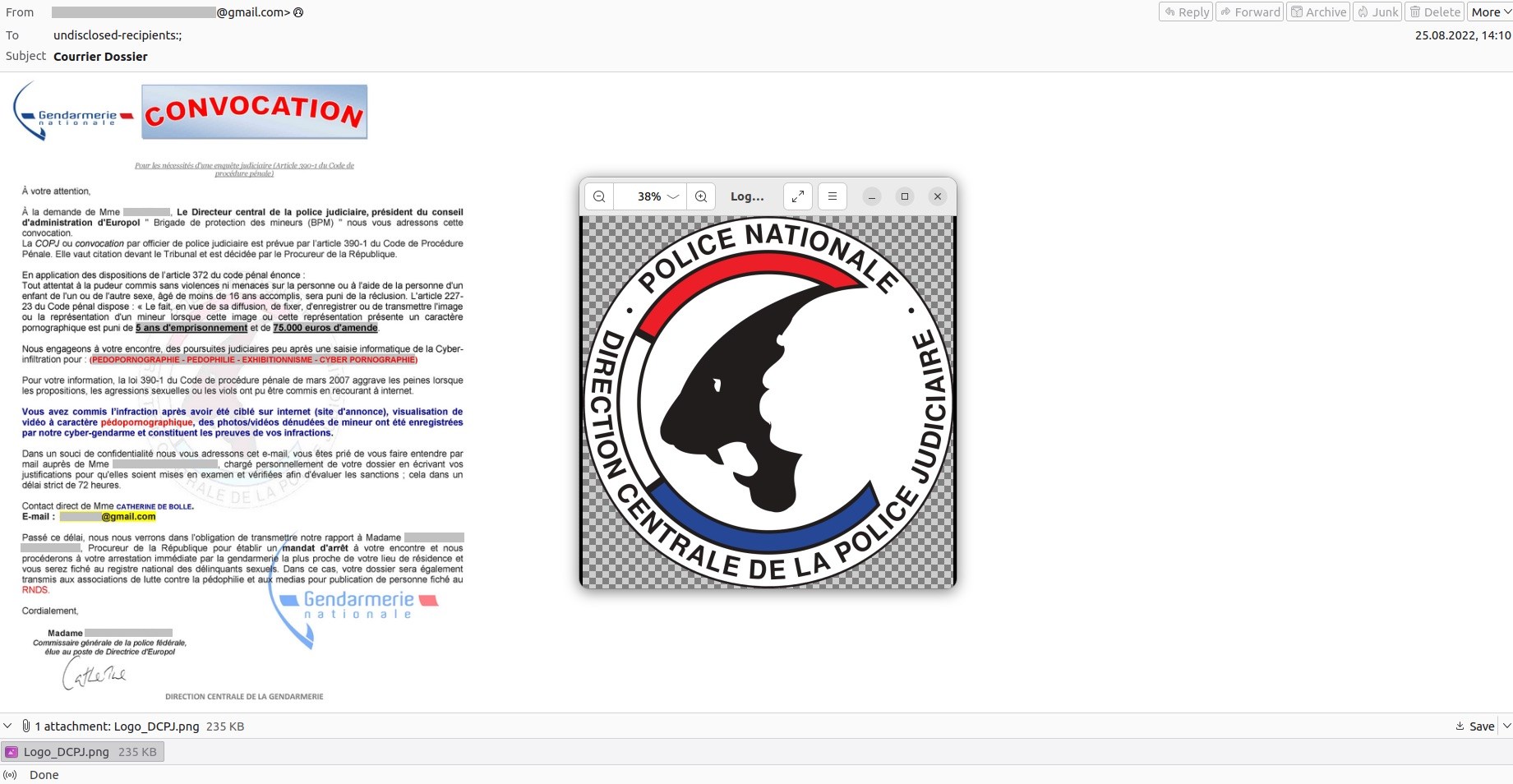 Dans ces attaques, les escrocs se font passer pour des agents des forces de l’ordre. Ils ne demandent pas d’argent tout de suite, car cela éveillerait les soupçons. Au lieu de cela, la victime reçoit une « convocation » l’accusant d’avoir commis un crime grave, souvent très délicat. Il s’agit généralement d’allégations de distribution de pornographie (y compris de pédopornographie), de pédophilie, de traite d’êtres humains ou même d’outrage à la pudeur. Les « preuves » ne sont pas tirées de nulle part, mais proviennent prétendument directement de l’ordinateur de la victime, auquel les « services spéciaux » ont obtenu un « accès à distance ».