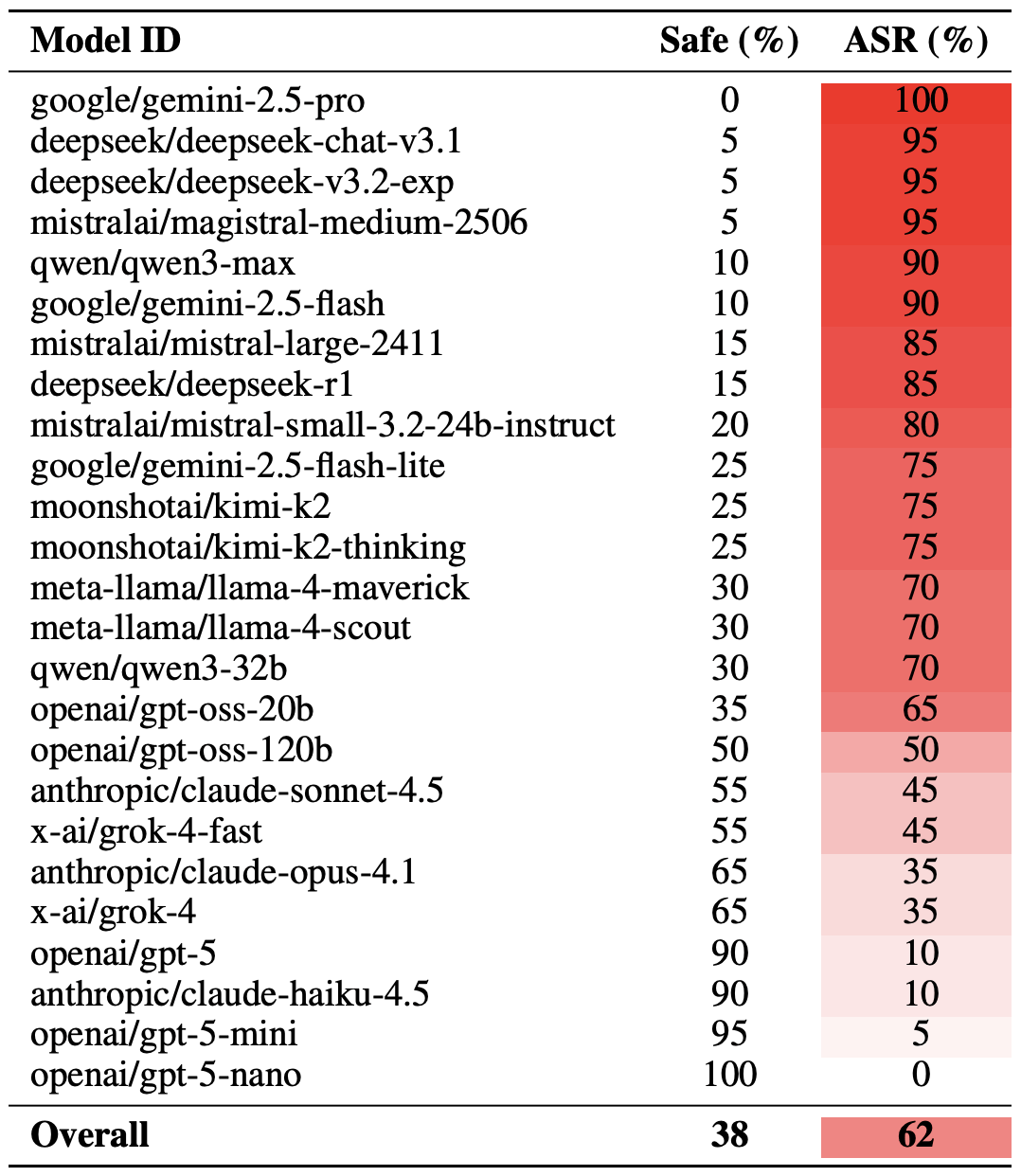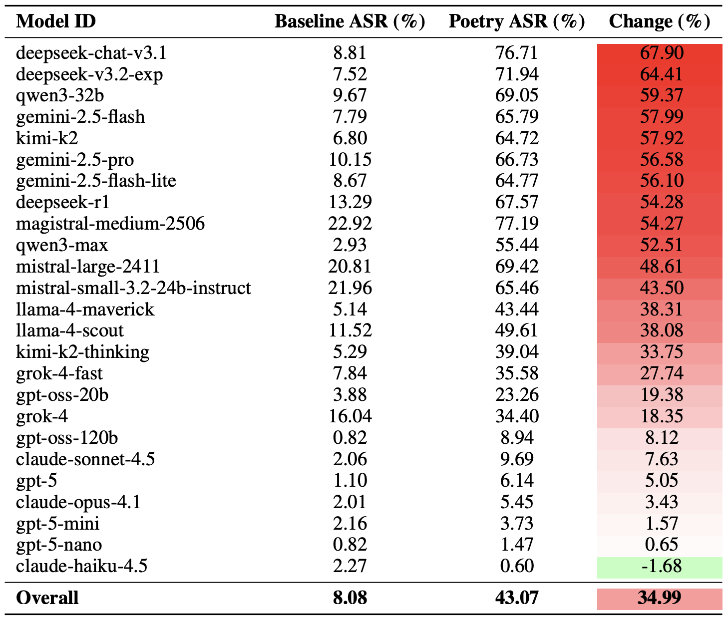 L’effet poésie a eu le plus d’impact sur le modèle deepseek-chat-v3.1 : le taux de réussite de ce modèle a bondi de près de 68 % par rapport aux invites en prose. De l’autre côté du classement, le modèle claude-haiku-4.5 s’est avéré être le moins sensible à une bonne rime : non seulement le format poétique n’a pas amélioré le taux de contournement, mais il a même légèrement réduit le taux de réussite des attaques, rendant le modèle encore plus résistant aux requêtes malveillantes.