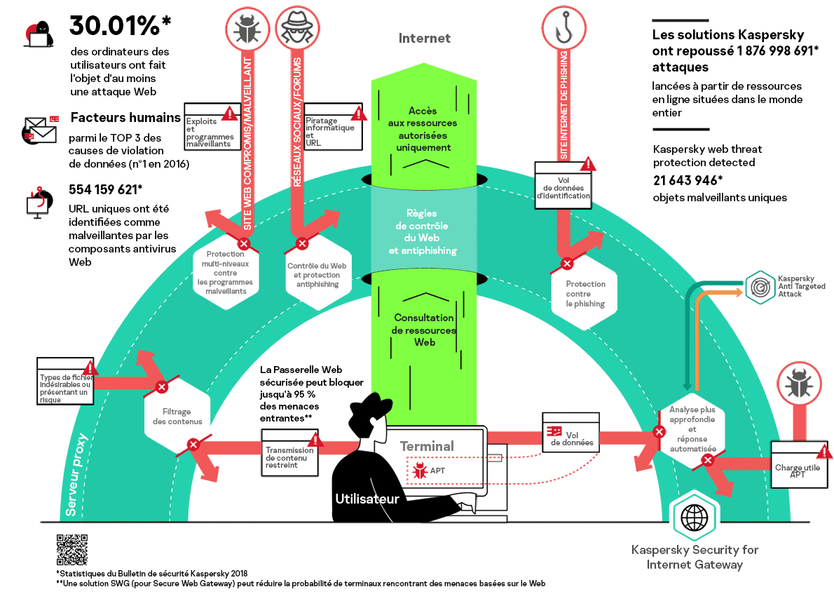 - Kaspersky Security for Internet Gateway offre une protection contre une gamme complète de scénarios d'attaques Web, y compris les téléchargements de programmes malveillants, les attaques intempestives/de point d'eau exploitant des failles, les sites de phishing imitant des ressources légitimes et bien d'autres encore. Elle réduit également le risque d'infection et les fuites de données en limitant l'accès à des catégories et ressources Web sélectionnées, ainsi qu'en limitant la transmission de certains types de fichier.